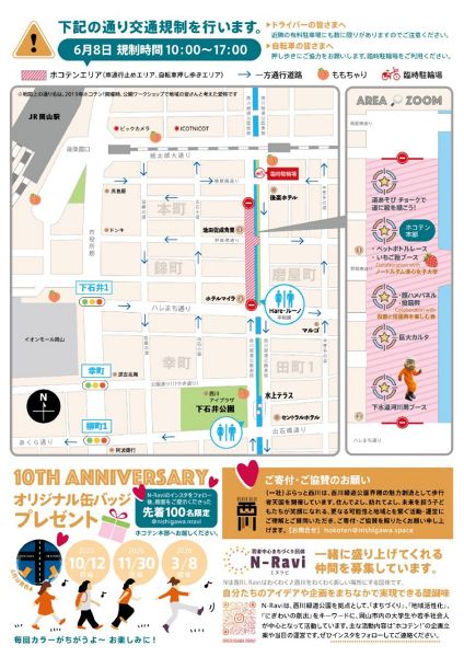 「子どもホコテン!」をテーマに子どもたちが楽しめるイベントブースを展開。扇子を投げて的に当てる日本の伝統的なゲーム「投扇興」、道路にチョークでお絵描きや下水道管玉入れなど、普段は遊ぶことのできない車道を使った様々な体験ができる。10周年の記念ノベルティとしてオリジナル缶バッチのプレゼントも。荒天中止。