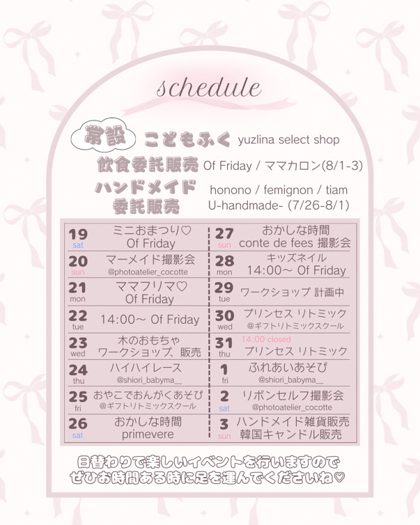 お子さまが楽しめる内容を日替わりで出店予定。詳細はInstagramよりご確認ください。