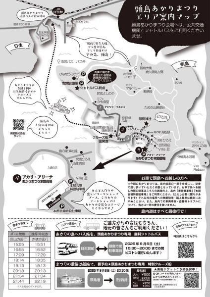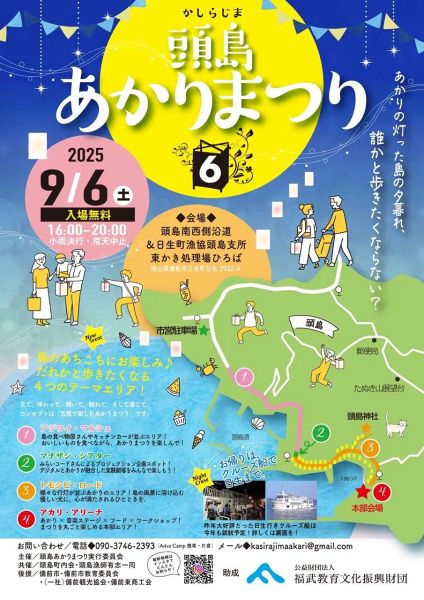 夕暮れの頭島の島内あちこちに明かりがともる中、キッチンカーが並ぶエリアや音楽ステージを設けるエリアなど四つのテーマエリアで散策を楽しめる。イベント終了後、JR日生駅までのナイトクルーズ船を運航する(ホームページから要予約、定員に達し次第締め切り)。雨天中止、少雨決行。