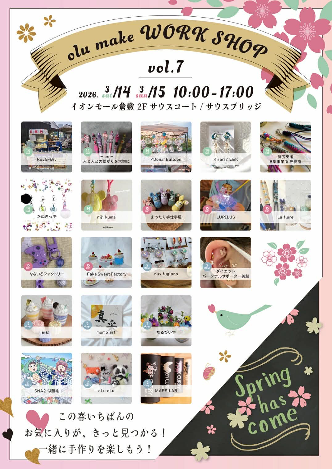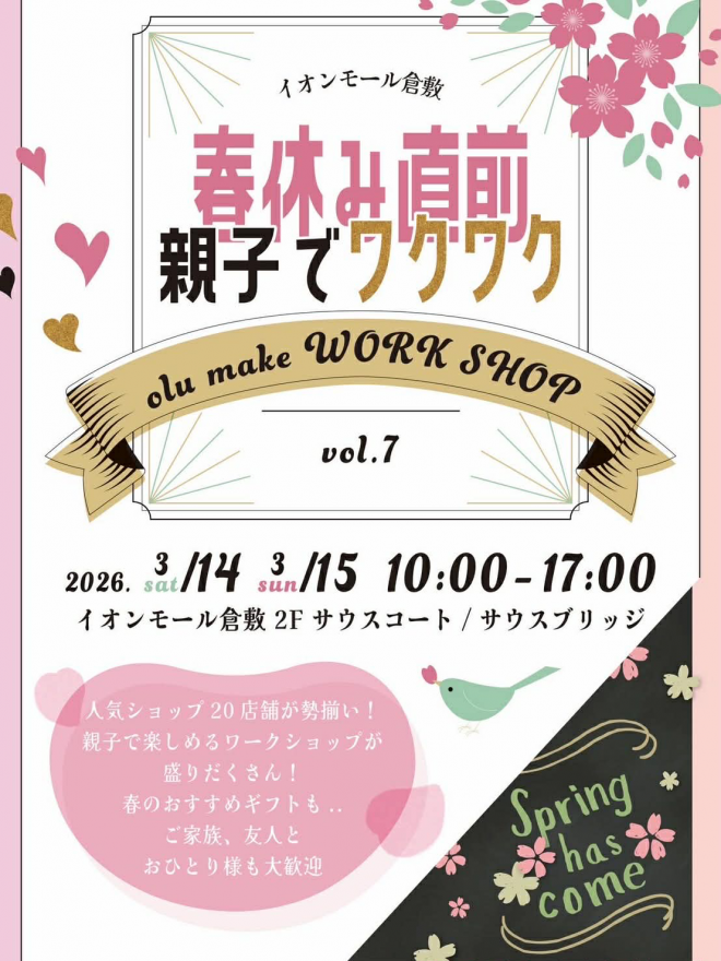 親子で一緒に楽しめる体験型イベント「olu make vol.7 春休み直前 親子でワクワクワークショップ」 を開催します。
