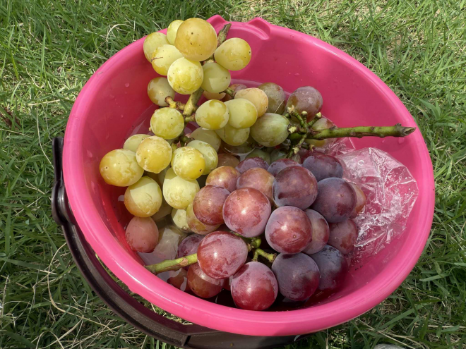 赤いバケツにはぶどうを冷やすための水、青いバケツには収穫用のハサミ。