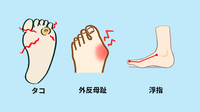 タコや魚の目ができやすくなるだけでなく、浮き指や外反母趾にもなりやすいのです。