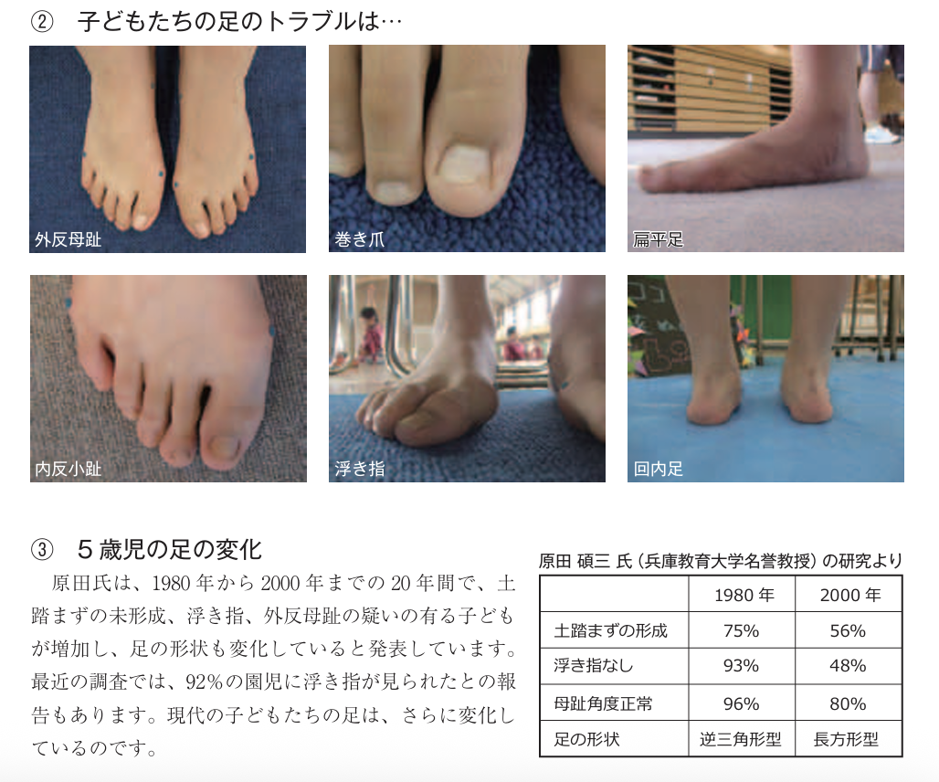 それ以外にも、浮き指や外反母趾など足のトラブルが起きているお子さんも増えてきています。