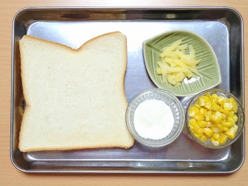 甘味とチーズの塩気がとても美味しい一品。食パンの耳は残したままの方が裏ごしトウモロコシが塗りやすいです。朝食や3時のおやつにオススメですよ!