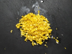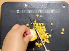 ①ゆでた(蒸した)トウモロコシの実を包丁でこそげ取る。