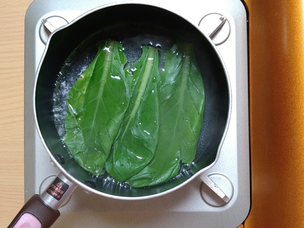 ②小松菜は葉っぱの部分を柔らかく煮て粗熱を取り裏ごしする。
