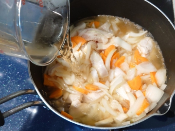 ①タマネギは薄切り、ニンジンはいちょう切りにする。