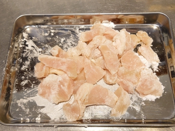 ③鶏むね肉は食べやすい大きさに切り、片栗粉をまぶす。