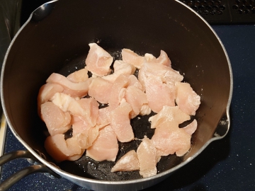 ④鍋にサラダ油、鶏むね肉を入れて中火にかける。