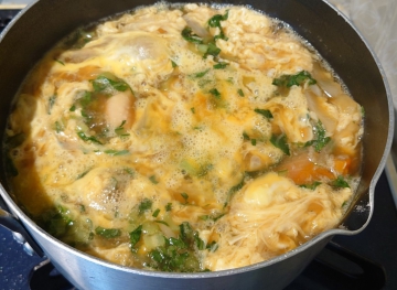 ⑧小松菜に火が通ったら卵でとじる。お好みの固さになったら火を止める。