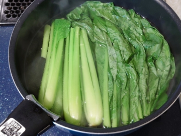 ②小松菜はお湯で茹でる。茹で上がったら水にとり、冷めたら水気をしっかり絞り一口大に切る。