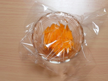 ①ニンジンは皮を剥いて千切りにする。耐熱皿に水大さじ1と一緒に入れてふんわりラップをして600Wで2分加熱する。冷めたら水気を絞る。