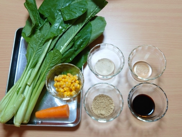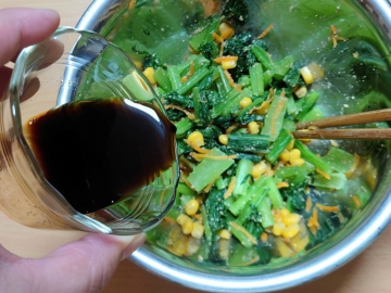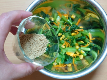 ④ボウルにニンジン、小松菜、コーン、すりゴマを加えて混ぜ合わせる。