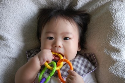 おもちゃを口に運ぶ“なめなめ期”。