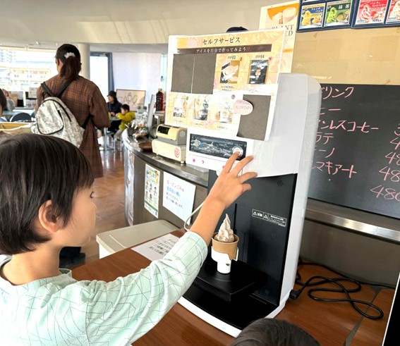 中でもソフトクリームは、自分でボタンを押して出来上がりを待つセミセルフの体験型で、子どもたちに大人気!