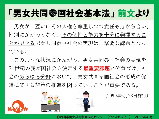 重要な法律には「前文」が付くと言われていますが、男女共同参画社会基本法にも「前文」が付いています。